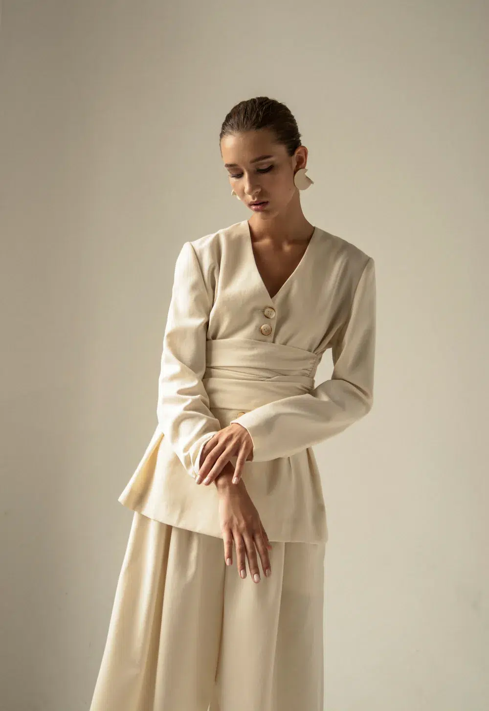 A new-season update on a design classic, the cream wool knot suit is cut from a vintage-inspired pattern from 80s. Spun from 100% virgin wool, the bold single-breasted style jacket features a panels knot waist creating multiple styling options. The matching trousers from the same fabric create a confident look. Designed with a high-cut pleated waistline, a hook fastener, invisible side pockets and a zip front add a boyish twist. The focus of this silhouette is on balancing proportions. Unlined.