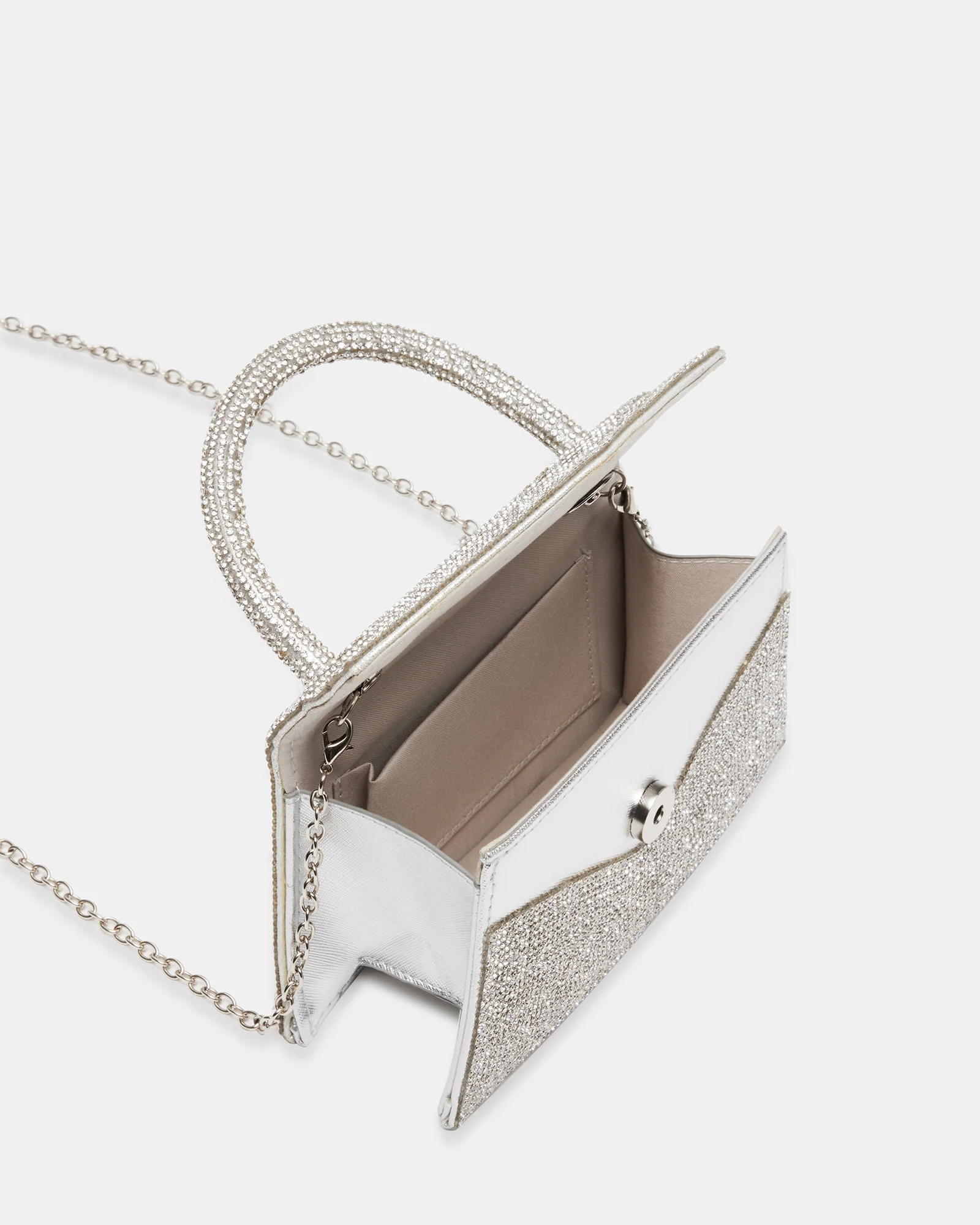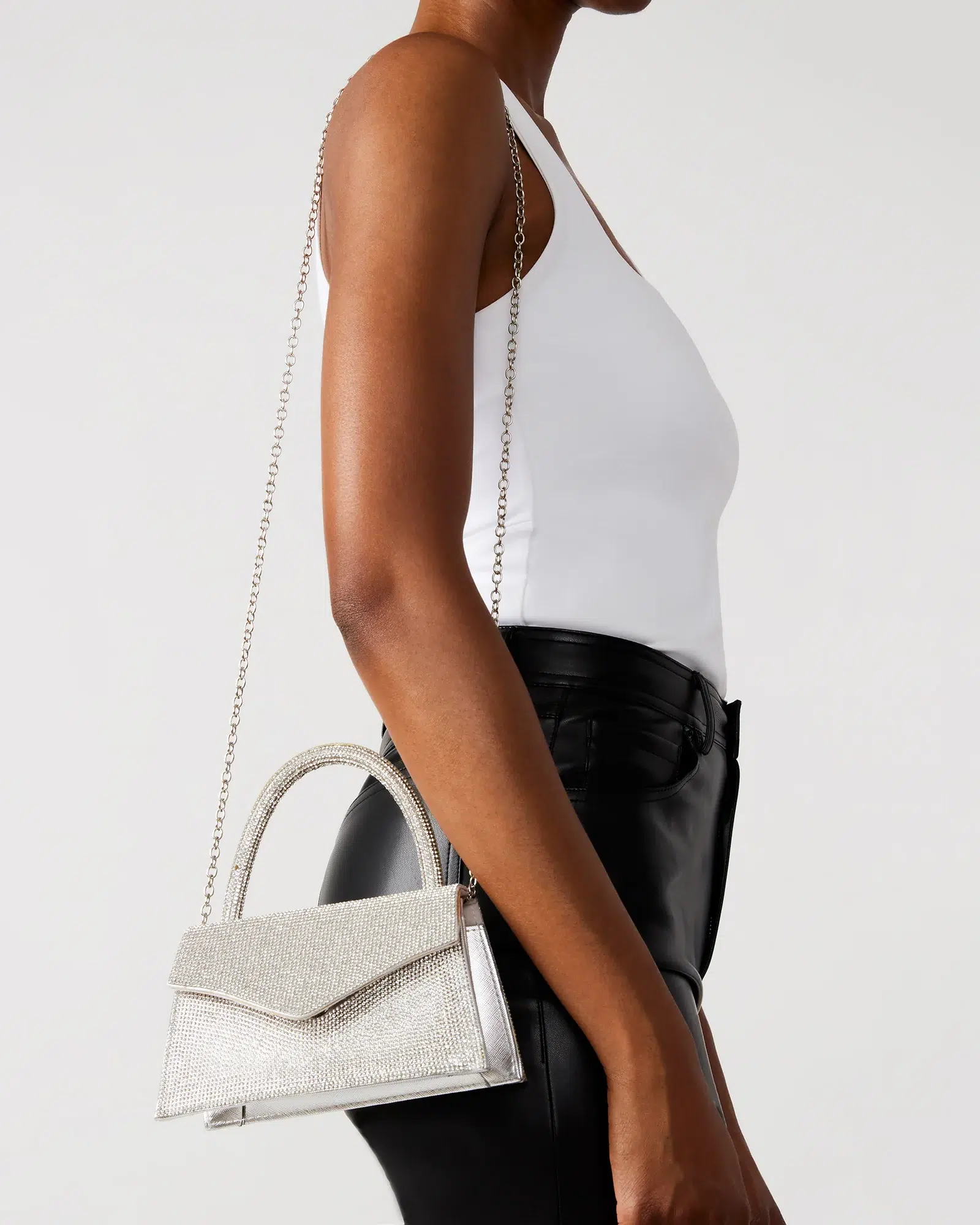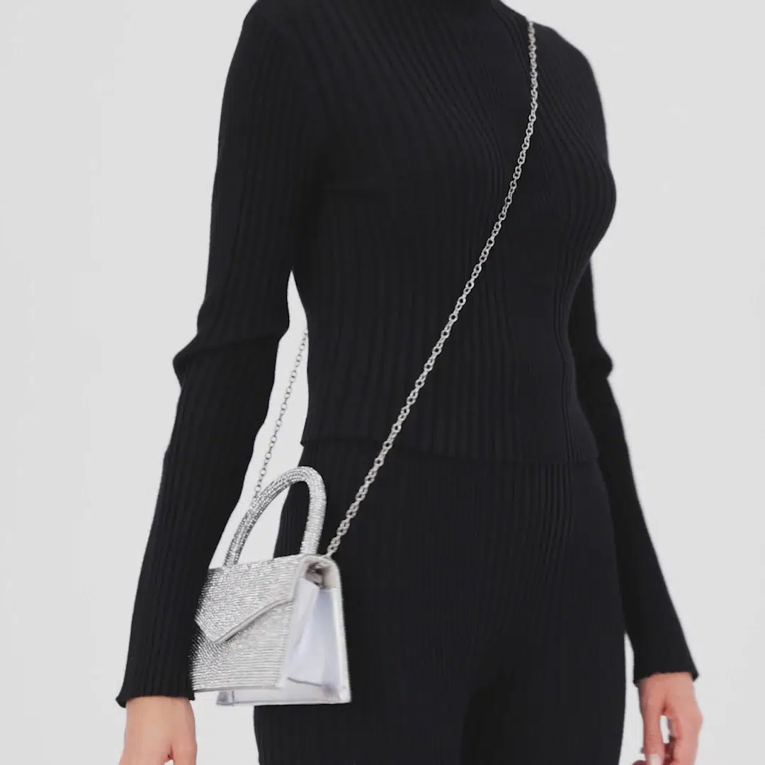 The bag is a structured trapezoid bag that’s encrusted with allover rhinestone embellishment and finished with a matching top handle.
